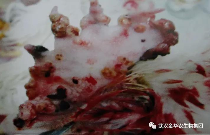 (3)嚴重時病變逐漸融合擴展,形成一層隆起的黃白色干酪樣假膜,強行剝離假膜,裸露出血的潰瘍面。假膜擴大、增厚,甚至阻塞咽喉部,引起病雞呼吸和吞咽困難。
