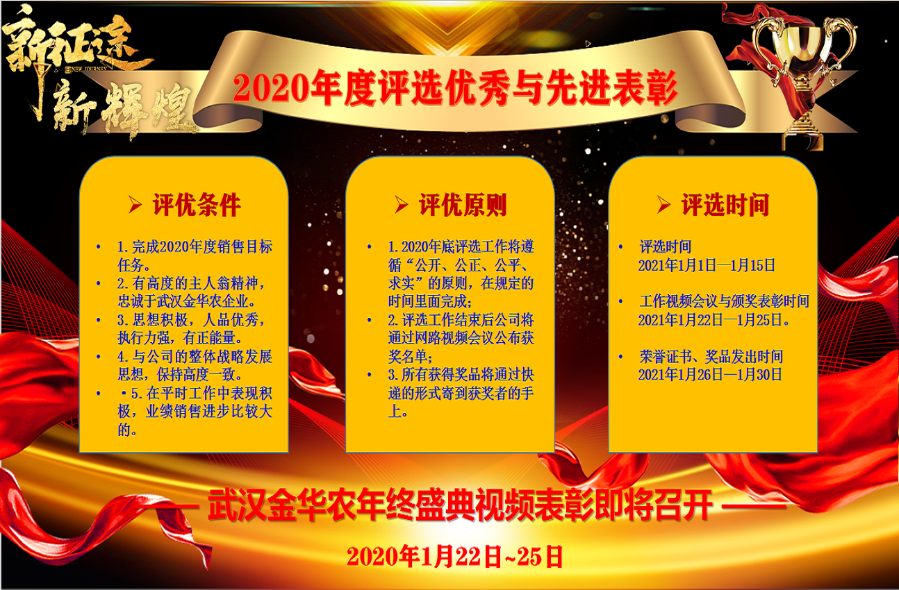 ? ? 在現(xiàn)今到來(lái)的2021年時(shí)間里,讓我們統(tǒng)一思想,統(tǒng)一步伐,堅(jiān)定信念,斗志昂揚(yáng),積極行動(dòng),全面沖刺2021年銷售目標(biāo)任務(wù)。2021年1月份又將是一個(gè)新的起點(diǎn)、一個(gè)新的開(kāi)始,事事早,成功早!公司號(hào)召全體武漢金華農(nóng)同志們,人人爭(zhēng)當(dāng)冠軍,人人爭(zhēng)當(dāng)標(biāo)兵!