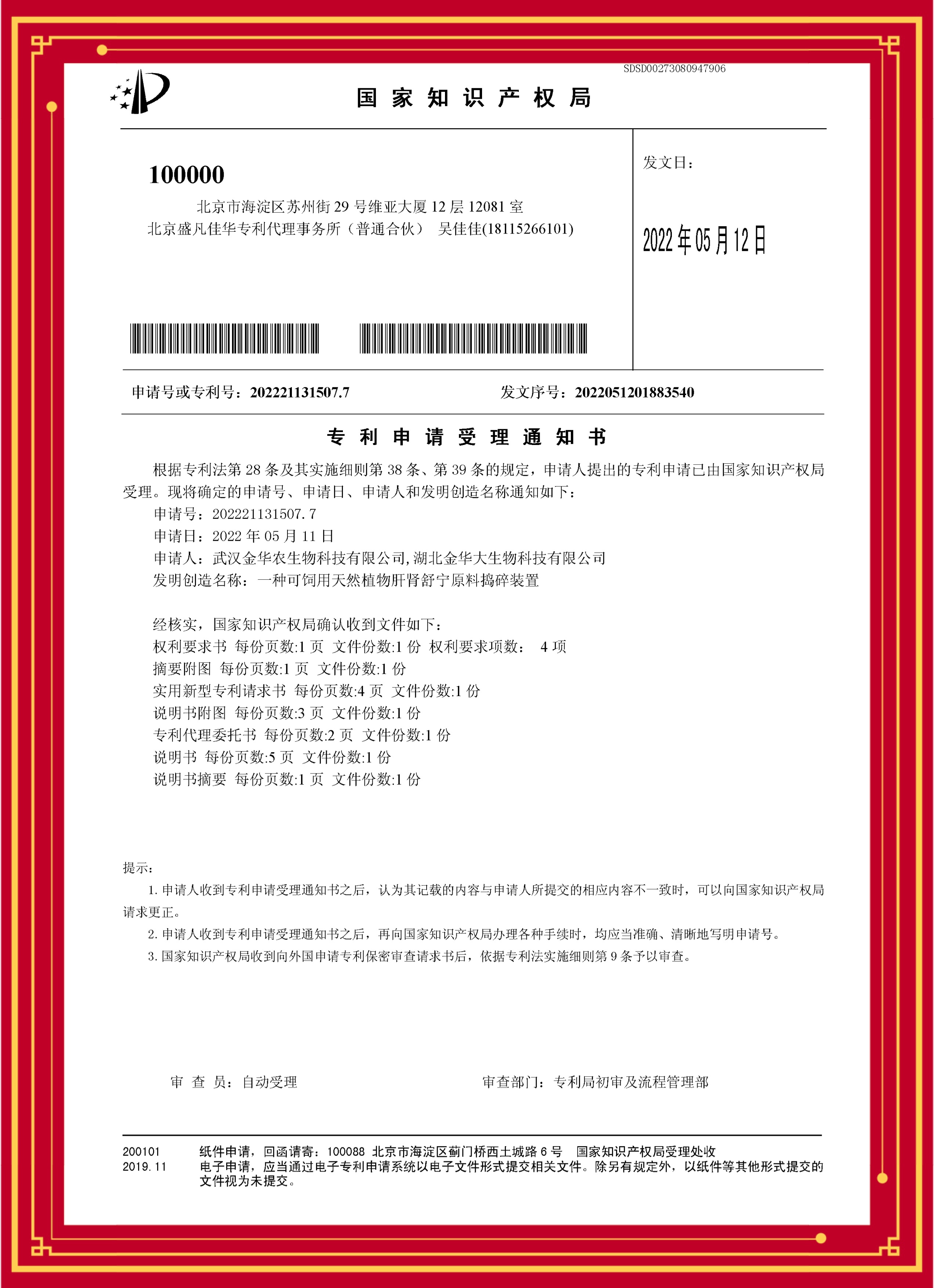 ? ? 繼“優(yōu)樂肽、快速壯、氟泰肺寧、藍(lán)圓瘟毒克、高熱病毒靈、金替呼諾”產(chǎn)品榮獲專利證書后,近日,武漢金華農(nóng)又一批拳頭產(chǎn)品獲得專利證書。產(chǎn)品“伊苯佳、黃金多維C、肝腎舒寧、弓球痢康、金普西林”5項(xiàng)目科技發(fā)明獲得國(guó)家榮譽(yù)專利,《一種家禽養(yǎng)殖用殺蟲劑伊苯佳配制長(zhǎng)效裝置》,專利號(hào):202221076567.3;《一種用于飼料添加劑黃金多維C的輔料原料粉碎增效機(jī)構(gòu)》,專利號(hào):202221071292.4;《一種可飼用天然植物龍膽護(hù)肝素肝腎舒寧原料搗碎裝置》,專利號(hào):202221131507.7;《一種獸藥生產(chǎn)用弓球痢康粉劑包裝機(jī)》,專利號(hào):202221108553.5;《一種生產(chǎn)獸藥金普西林用的快速分散旋轉(zhuǎn)擠壓混合設(shè)備》,專利號(hào):202221407935.8,獲得國(guó)家知識(shí)產(chǎn)權(quán)局授權(quán),并獲得專利受理證書。