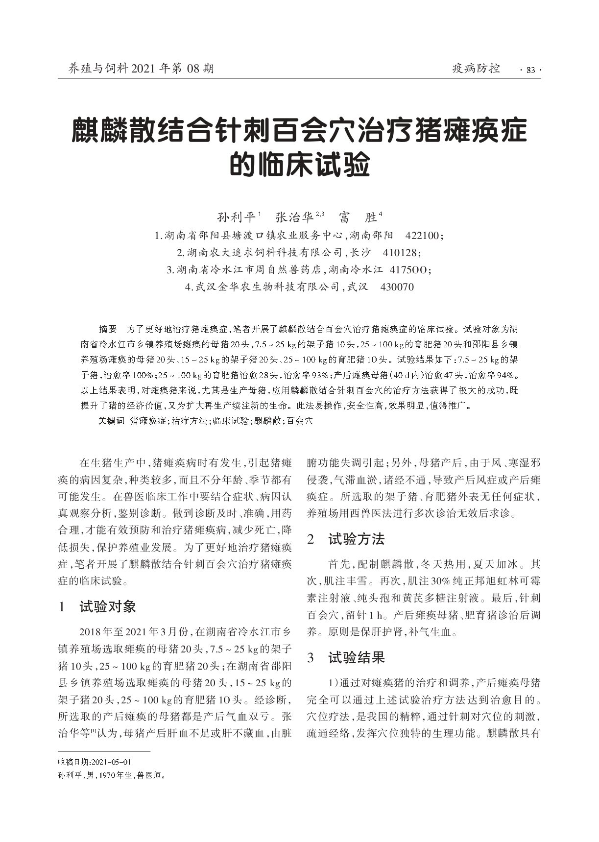 麒麟散結(jié)合針刺百會穴治療豬癱瘓癥的臨床試驗(yàn)