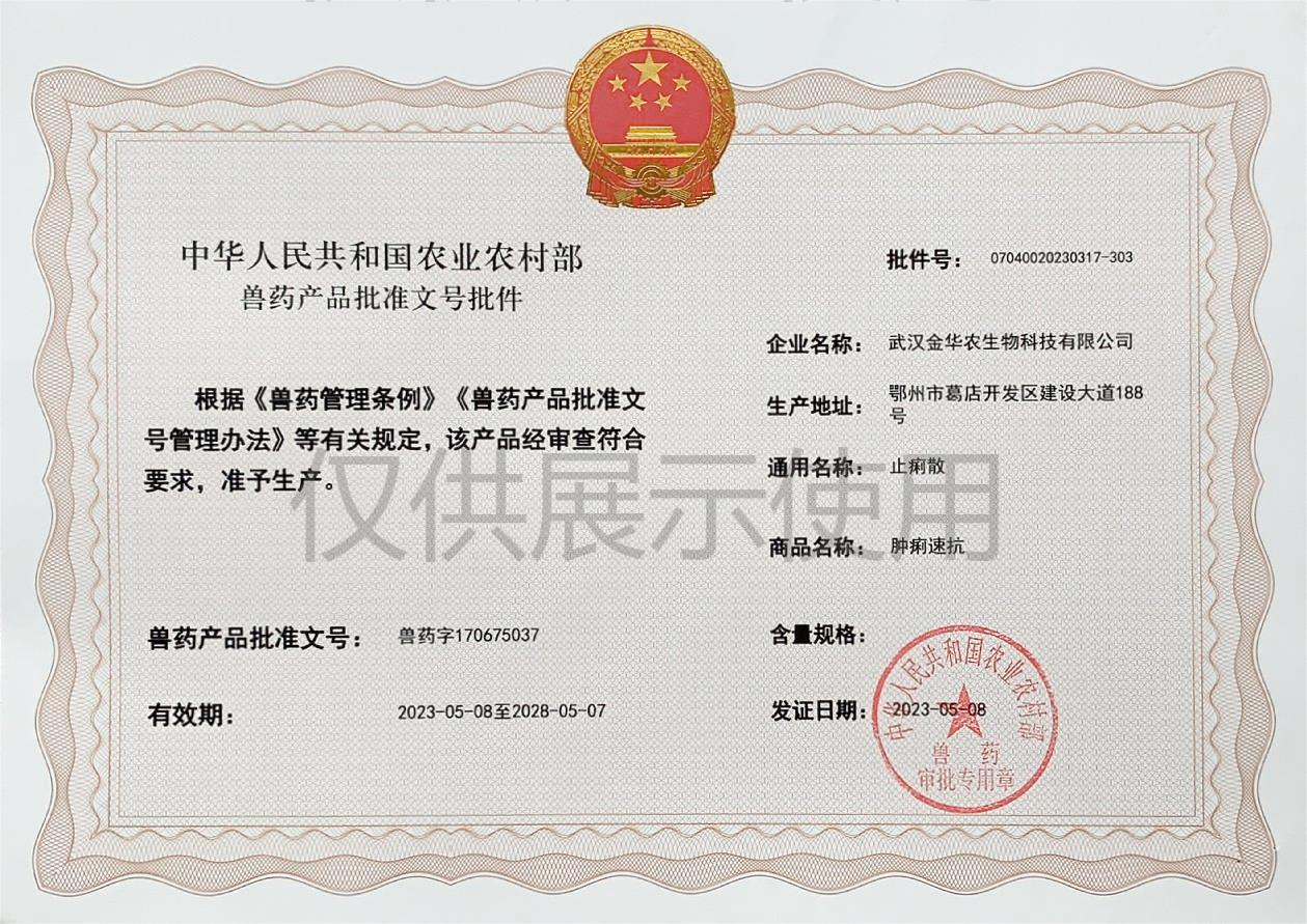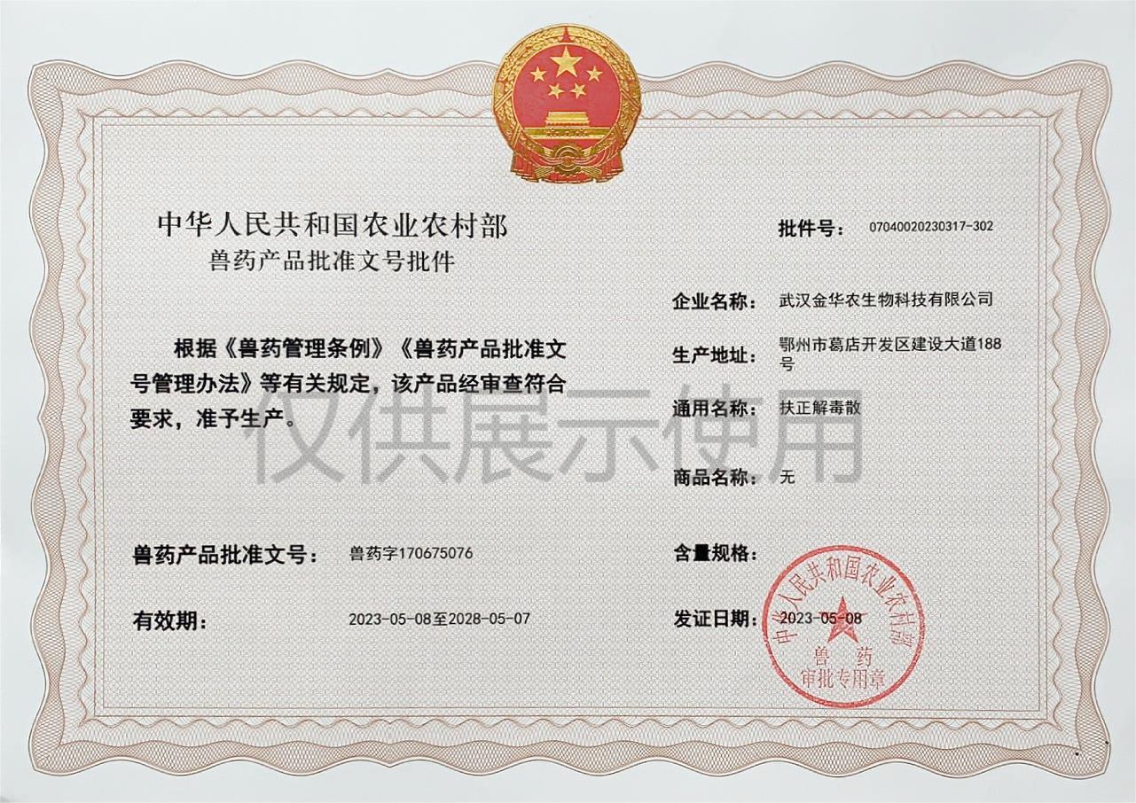 根據(jù)《獸藥管理?xiàng)l例》和《獸藥產(chǎn)品批準(zhǔn)文號(hào)管理辦法》的規(guī)定,經(jīng)國家農(nóng)業(yè)農(nóng)村部審查,準(zhǔn)予核發(fā)武漢金華農(nóng)生物科技有限公司(以下簡稱“武漢金華農(nóng)生物”)國家新版GMP獸藥相關(guān)產(chǎn)品批準(zhǔn)文號(hào)。