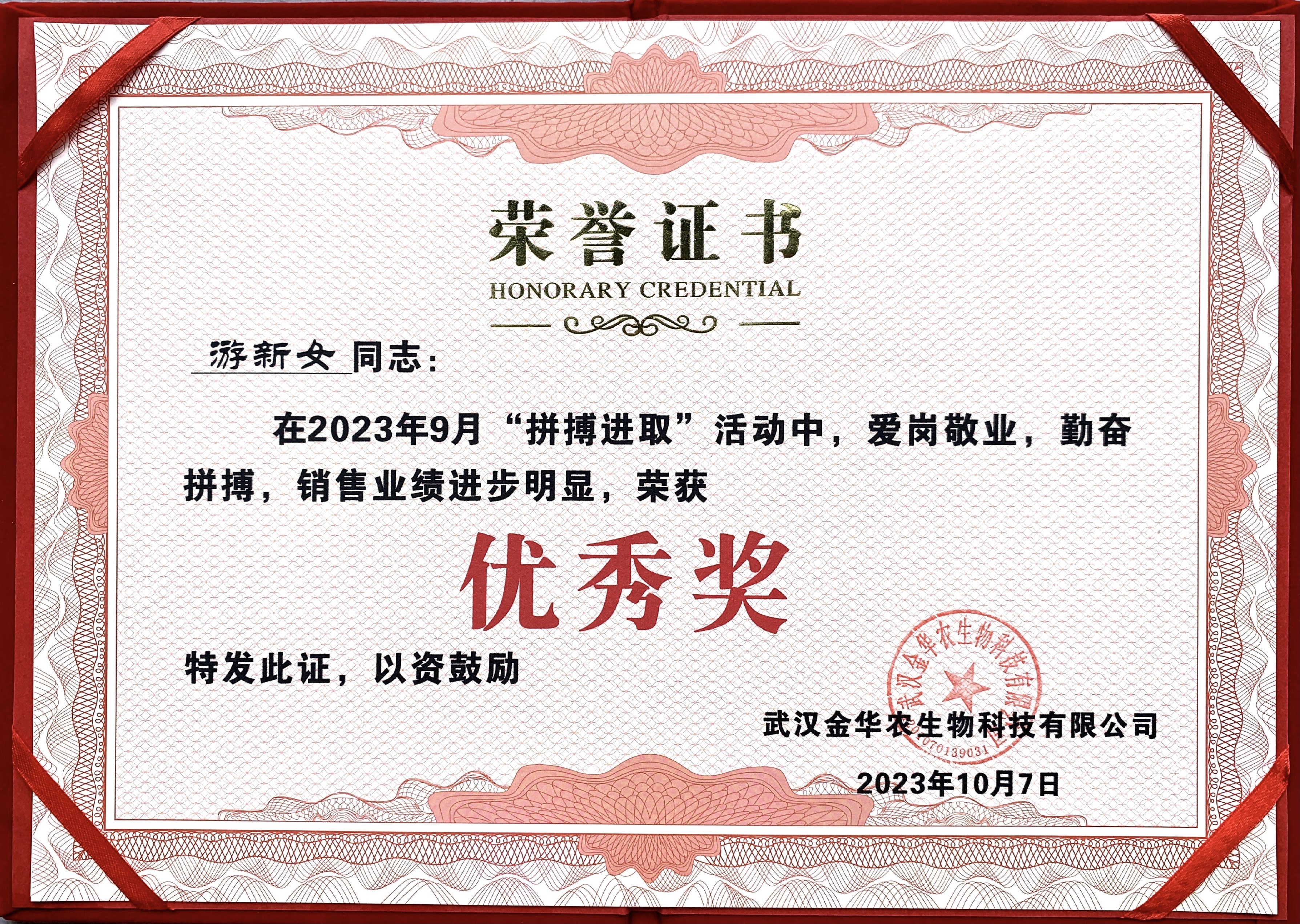 祝賀河南市場楊曉濤經(jīng)理在2023年“拼搏進(jìn)取”活動中榮獲三等獎。他從不計較個人得失,從無怨言,辛勤耕耘,默默奉獻(xiàn),用實際行動履行自己的工作,把工作當(dāng)成使命,把優(yōu)秀當(dāng)成追求,以最高的標(biāo)準(zhǔn)展現(xiàn)自己的人生價值。為武漢金華農(nóng)的發(fā)展做出了自己應(yīng)有的貢獻(xiàn)。