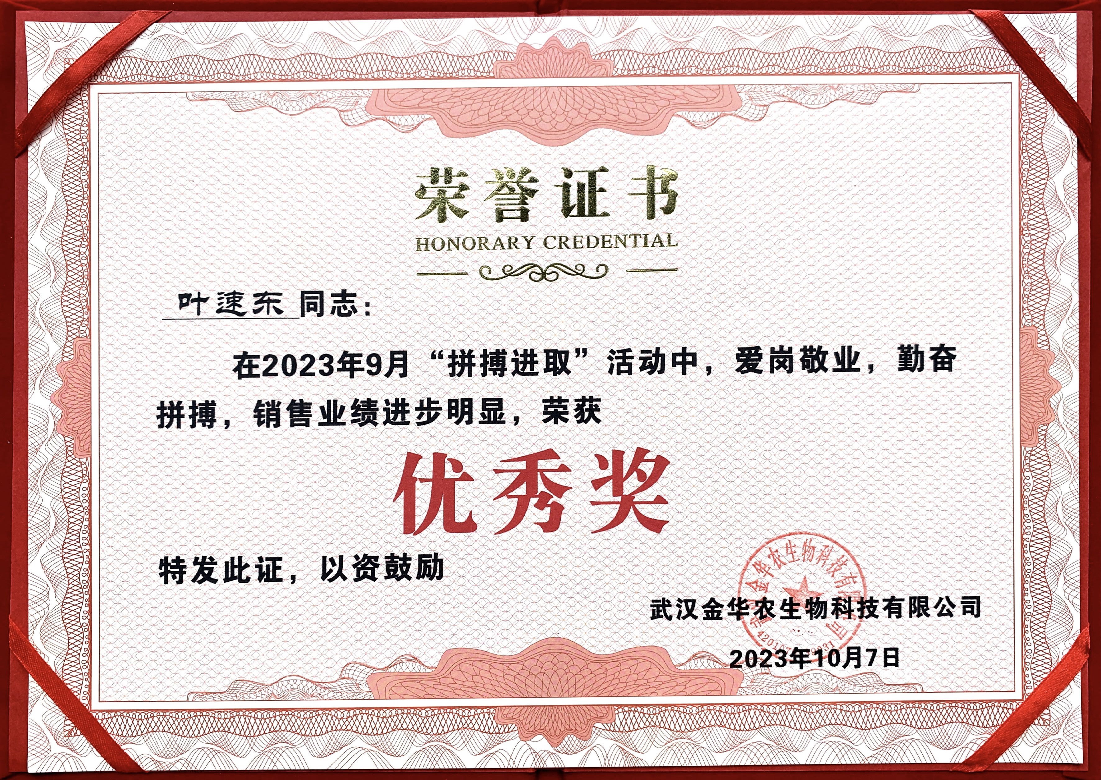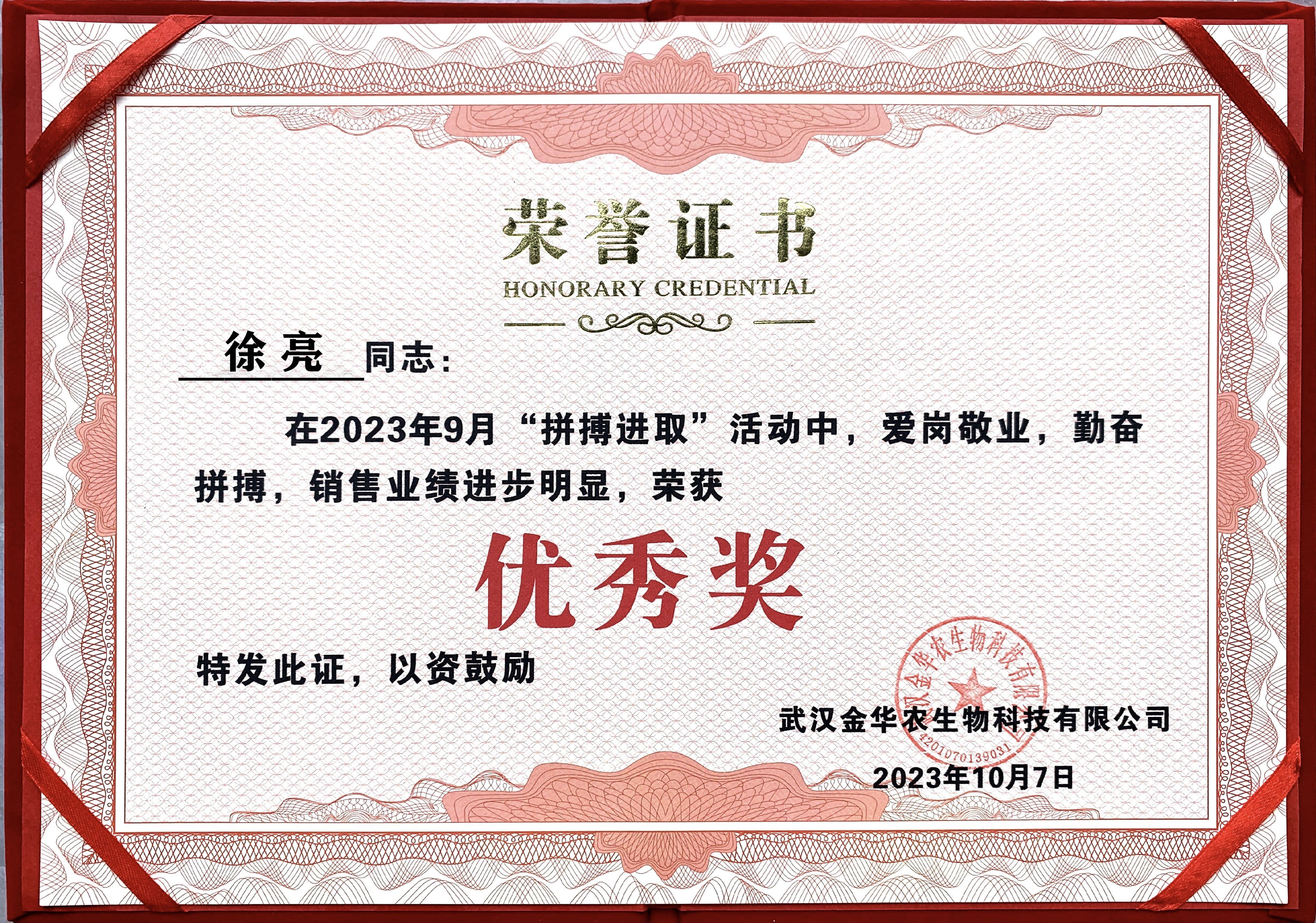 祝賀廣州市場孟小平經(jīng)理在2023年“拼搏進(jìn)取”活動中榮獲優(yōu)秀獎。作為奮斗在市場一線的他,每天要面對形形色色的客戶,想客戶所想,急客戶所急,為客戶排憂解難,獲得了越來越多客戶的認(rèn)可。一切為了銷售、業(yè)績就是最強(qiáng)有力的話語,他自身的價值也在銷售中得到淋漓盡致的體現(xiàn)。他必將帶動武漢金華農(nóng)更加美好的明天。