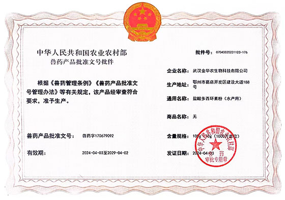 ? ? ??根據《獸藥管理條例》和《獸藥產品批準文號管理辦法》的規(guī)定,經農業(yè)農村部審查,準予核發(fā)武漢金華農生物科技有限公司3個新版GMP水產漁藥相關產品批準文號。