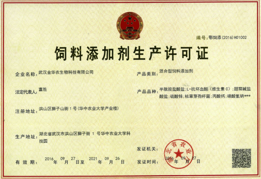 武漢金華農(nóng)生物喜獲“新一代”飼料添加劑生產(chǎn)許可證