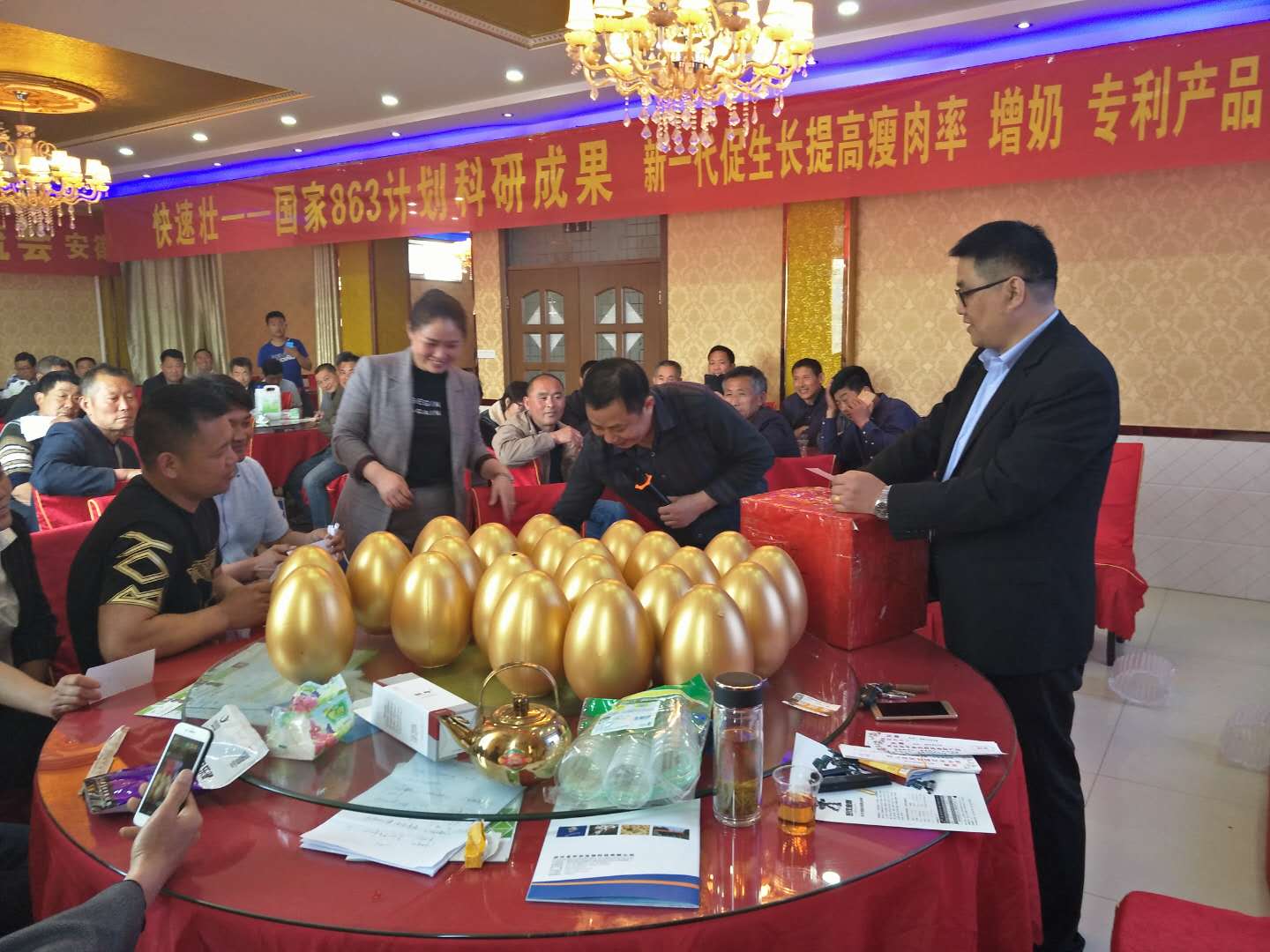 會(huì)議主題3: 母豬產(chǎn)后,氣血虧虛、體弱多病、免疫力下降、肌肉損傷較大,泌尿生殖道炎癥明顯增多,不發(fā)情,配不上,返情率高,產(chǎn)生免疫抑制及產(chǎn)后綜合應(yīng)激癥,母豬產(chǎn)前產(chǎn)后保健專用組合:黃芪靈芝寶500g+利高美諾500g+金普西林500g,拌料1000斤,連續(xù)飼喂5-7天,治療明顯,效果突出,受到在場(chǎng)的養(yǎng)豬戶的一直認(rèn)可和贊美!