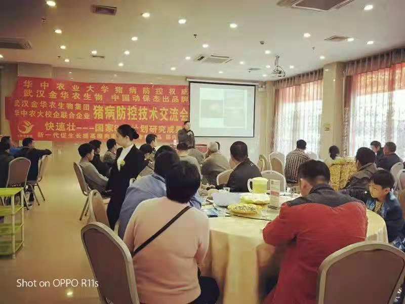 2018年11月25日,武漢金華農(nóng)生物生物科技有限公司“冬季豬病防控暨技術(shù)交流會”在廣西容縣勝利召開!本次會議由廣西大區(qū)覃經(jīng)理策劃與組織,公司技術(shù)部畜牧獸醫(yī)高級講師原金記老師主講,本次參會豬場老板達到60多人,會場氣氛熱烈而友好,會議效果良好,武漢金華農(nóng)產(chǎn)品質(zhì)量和臨床療效受到養(yǎng)殖戶的高度認可與贊美!