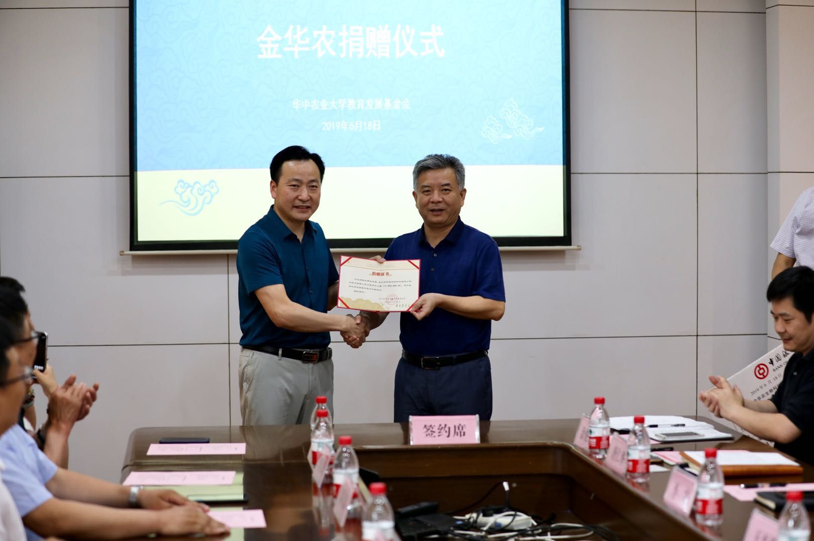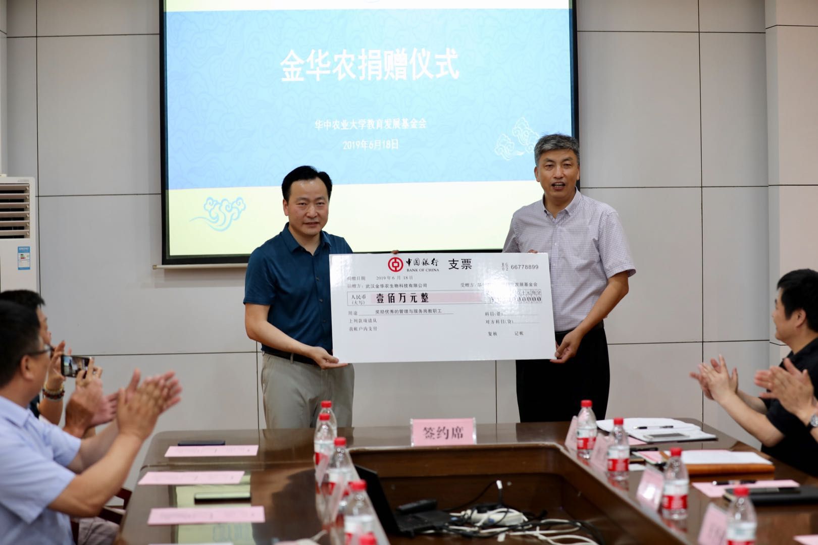 2019年6月18日,華中農(nóng)業(yè)大學(xué)“獎教金”設(shè)立儀式在該校行政樓會議室舉行,此次,武漢金華農(nóng)生物科技有限公司向該校捐贈100萬元,用于獎勵華中農(nóng)業(yè)大學(xué)優(yōu)秀的管理與服務(wù)崗教職工。