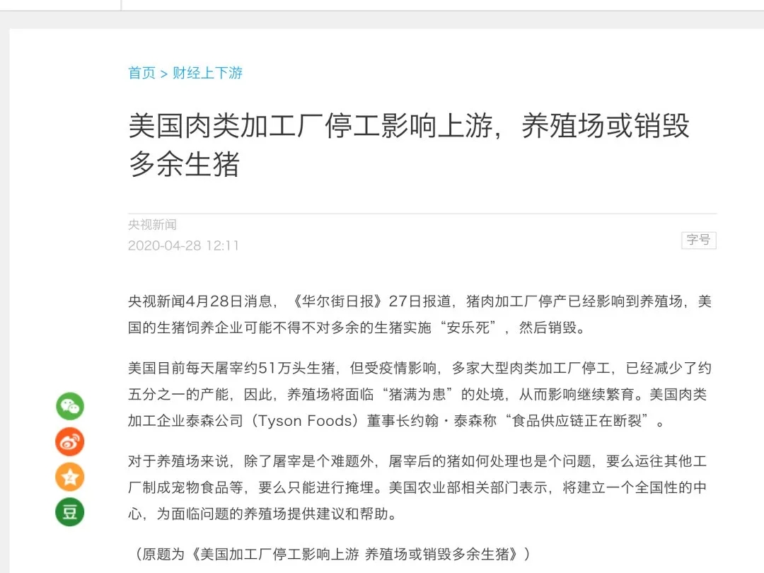 ???????受疫情影響,全美的肉類供應量減少了三分之一,全球也恐面臨肉類短缺,部分國家自顧無暇,中國的豬肉進口或將受到影響。