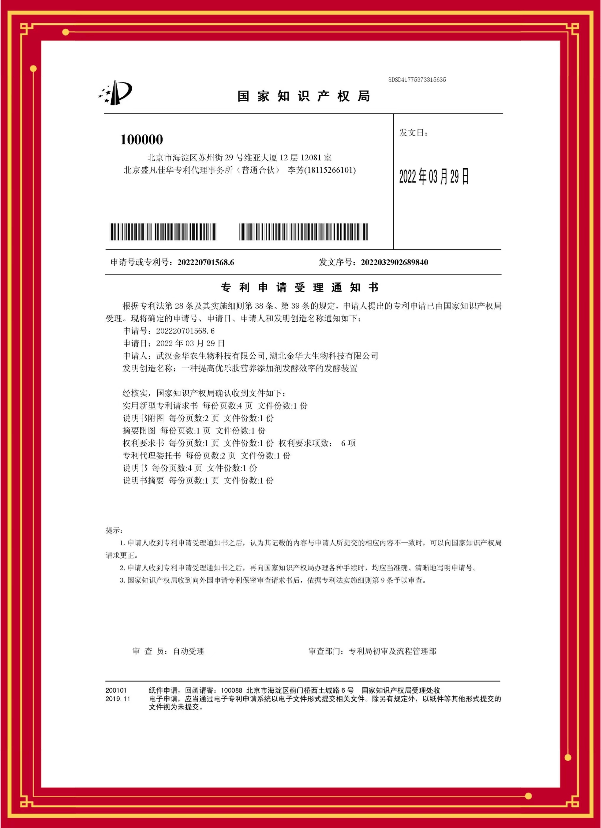 ? ? 近日,武漢金華農(nóng)申請的首批三個(gè)產(chǎn)品“優(yōu)樂肽、快速壯、氟泰肺寧”科技發(fā)明專利?!兑环N提高優(yōu)樂肽營養(yǎng)添加劑發(fā)酵效率的發(fā)酵裝置》,專利號:20220701568.6;《一種有效提高飼料添加劑快速壯包被效率的包被裝置》,專利號:202220719154.6;《一種提高氟泰肺寧粉劑粉碎效率的粉碎裝置》,專利號:20220701581.1,獲得國家知識產(chǎn)權(quán)局授權(quán),并獲得專利受理證書。