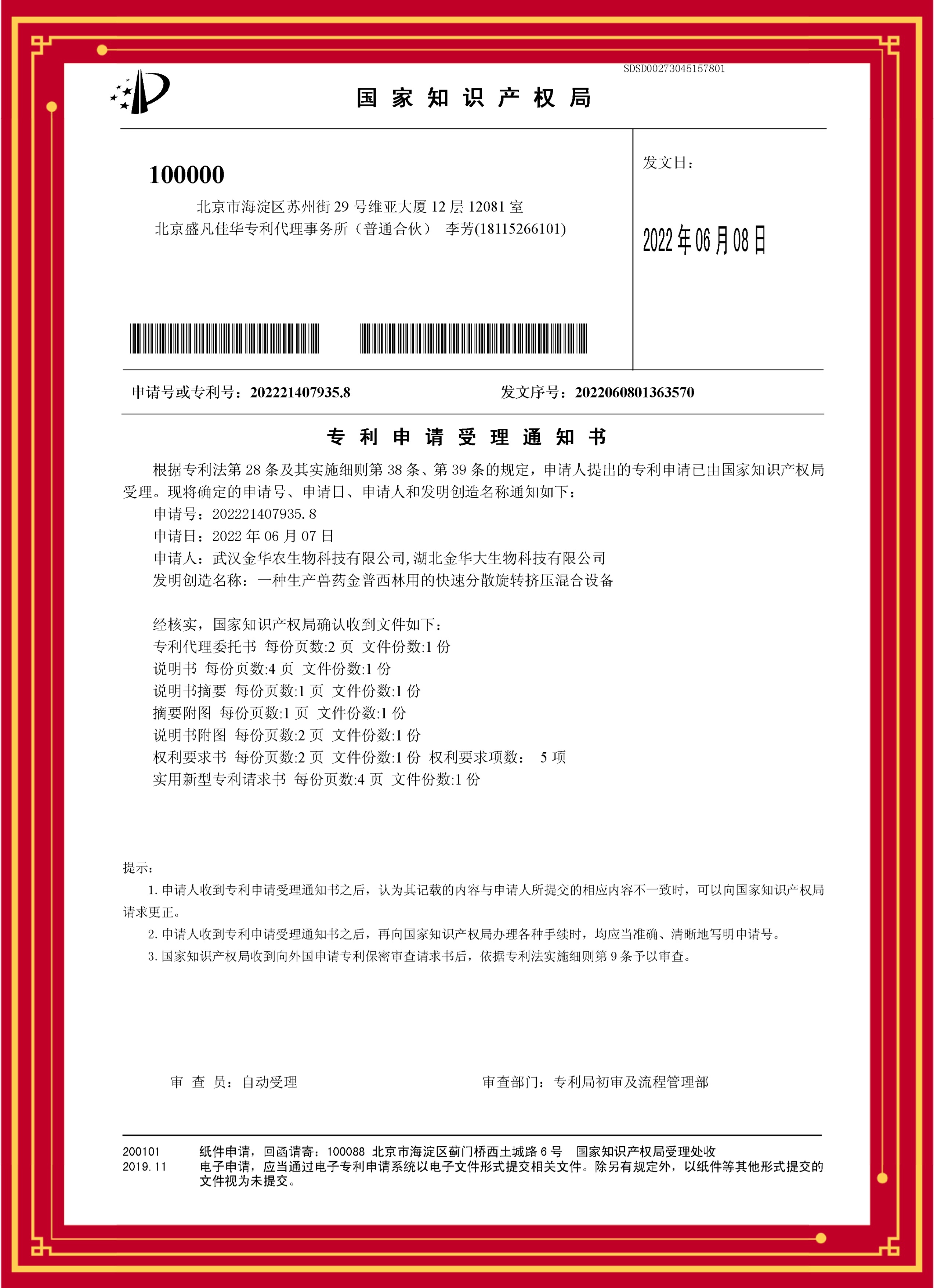 ? ? 繼“優(yōu)樂肽、快速壯、氟泰肺寧、藍(lán)圓瘟毒克、高熱病毒靈、金替呼諾”產(chǎn)品榮獲專利證書后,近日,武漢金華農(nóng)又一批拳頭產(chǎn)品獲得專利證書。產(chǎn)品“伊苯佳、黃金多維C、肝腎舒寧、弓球痢康、金普西林”5項(xiàng)目科技發(fā)明獲得國(guó)家榮譽(yù)專利,《一種家禽養(yǎng)殖用殺蟲劑伊苯佳配制長(zhǎng)效裝置》,專利號(hào):202221076567.3;《一種用于飼料添加劑黃金多維C的輔料原料粉碎增效機(jī)構(gòu)》,專利號(hào):202221071292.4;《一種可飼用天然植物龍膽護(hù)肝素肝腎舒寧原料搗碎裝置》,專利號(hào):202221131507.7;《一種獸藥生產(chǎn)用弓球痢康粉劑包裝機(jī)》,專利號(hào):202221108553.5;《一種生產(chǎn)獸藥金普西林用的快速分散旋轉(zhuǎn)擠壓混合設(shè)備》,專利號(hào):202221407935.8,獲得國(guó)家知識(shí)產(chǎn)權(quán)局授權(quán),并獲得專利受理證書。