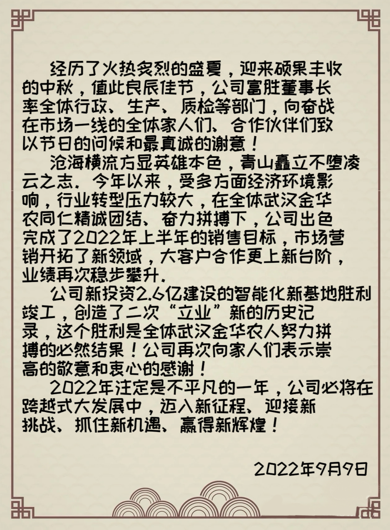 “吃在嘴里,甜在心里。”公司為每位員工送上節(jié)日的問候與祝福,溫暖了大家的眼角眉梢,也牽起了大家的嘴角。在武漢金華農(nóng)大家庭,匯聚了四面八方的歡聲笑語(yǔ),齊聚了五湖四海的秋思鄉(xiāng)情。