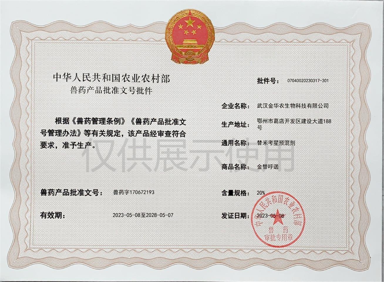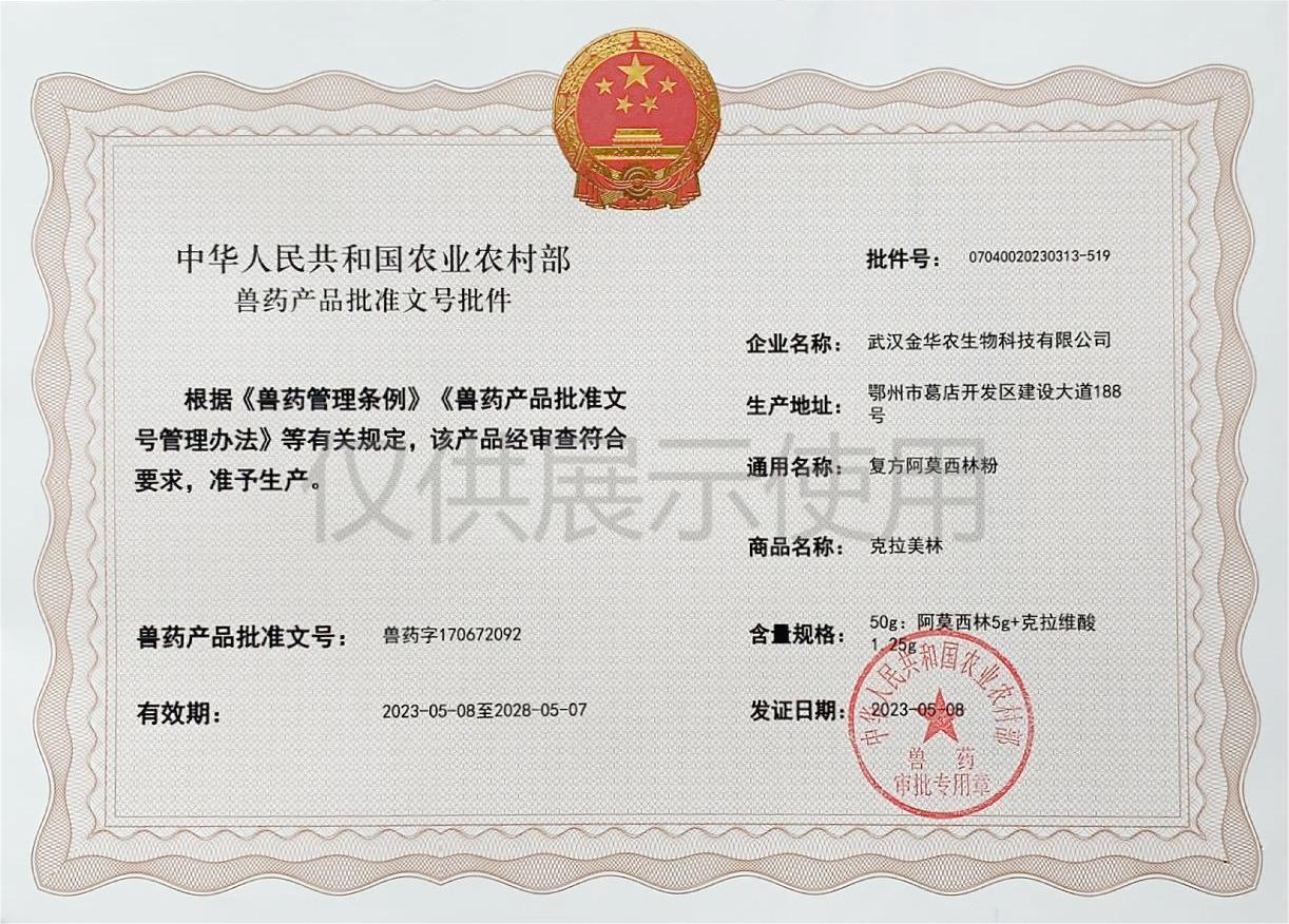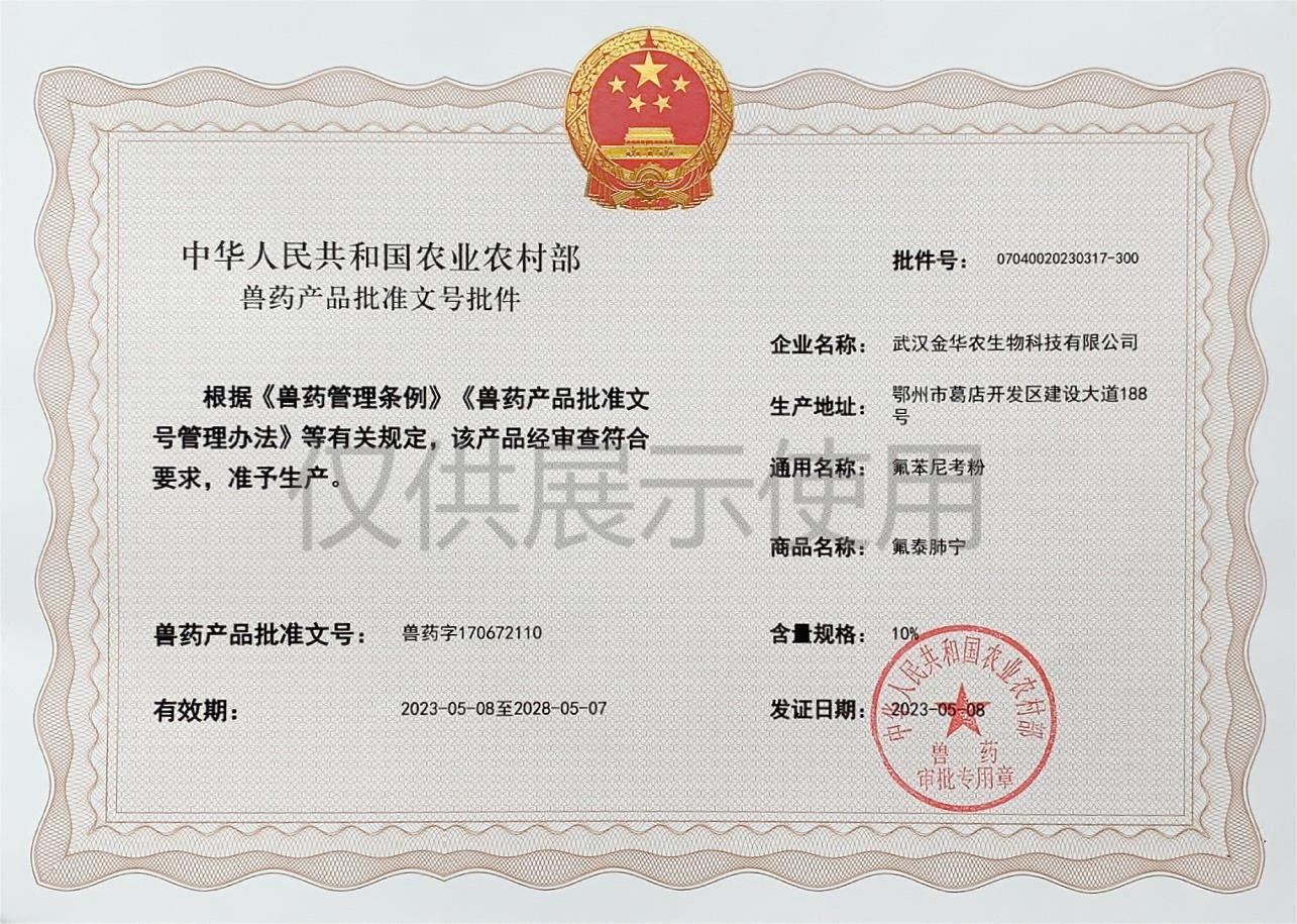 根據(jù)《獸藥管理?xiàng)l例》和《獸藥產(chǎn)品批準(zhǔn)文號(hào)管理辦法》的規(guī)定,經(jīng)國家農(nóng)業(yè)農(nóng)村部審查,準(zhǔn)予核發(fā)武漢金華農(nóng)生物科技有限公司(以下簡稱“武漢金華農(nóng)生物”)國家新版GMP獸藥相關(guān)產(chǎn)品批準(zhǔn)文號(hào)。