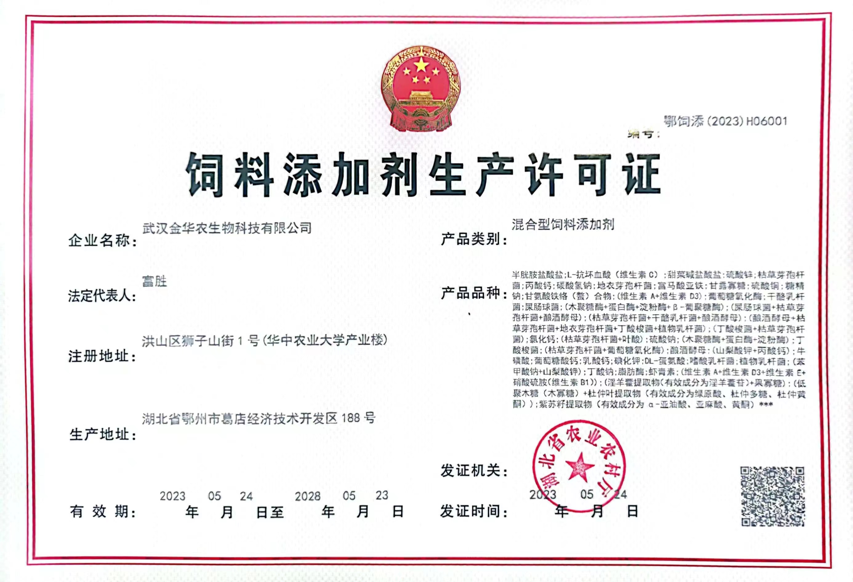 2023年5月24日,武漢金華農(nóng)生物科技有限公司(下文簡(jiǎn)稱(chēng)“武漢金華農(nóng)”)混合型飼料添加劑新生產(chǎn)線正式獲得湖北省農(nóng)業(yè)農(nóng)村廳頒發(fā)的“鄂飼添(2023)H06001生產(chǎn)許可證”和新的飼料添加劑45個(gè)新品種,這將進(jìn)一步完善公司產(chǎn)品的功能性覆蓋、進(jìn)一步擴(kuò)大市場(chǎng)占有率、進(jìn)一步促進(jìn)武漢金華農(nóng)的產(chǎn)業(yè)升級(jí)擴(kuò)容。