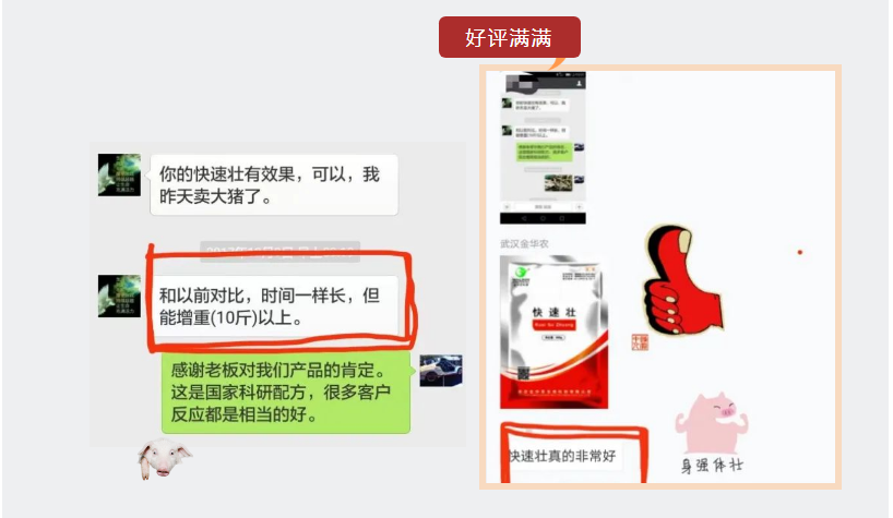 ? ? ?(2)阜陽本地區(qū)的養(yǎng)殖戶對公司專利產(chǎn)品“快速壯”十分認可,市場銷量非常好,經(jīng)養(yǎng)殖戶反饋,使用“快速壯”不到一周的時間,豬群食欲大增,采食量增加。使用半個月,豬只后驅(qū)明顯豐滿,豬毛發(fā)亮。經(jīng)對比,同時期出欄的豬群,用了“快速壯”的養(yǎng)殖戶一頭豬可以多賣300塊錢。張老師家的幾百頭牛也長期使用“快速壯”,能促進多余的營養(yǎng)成分轉(zhuǎn)化為脂肪,改善肉質(zhì)、增強瘤胃動力,育肥牛能多增重20-25斤,提前出欄。母牛妊娠期間使用“快速壯+奶倍加”黃金組合,能快速提高母牛的產(chǎn)奶量,延長泌乳高峰期,同時可以促進小牛的生長發(fā)育。
