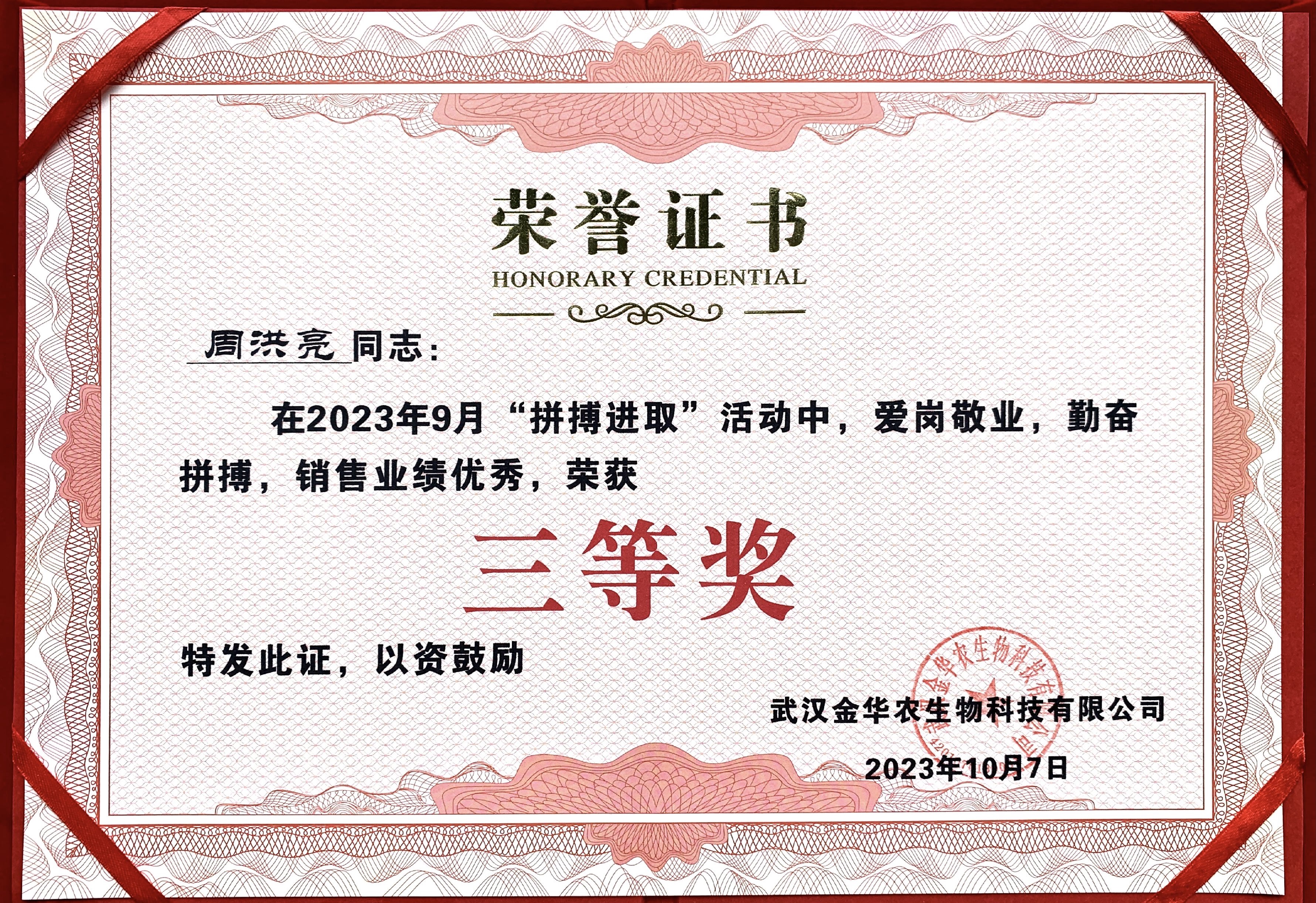 祝賀河南市場楊曉濤經(jīng)理在2023年“拼搏進(jìn)取”活動中榮獲三等獎。他從不計較個人得失,從無怨言,辛勤耕耘,默默奉獻(xiàn),用實際行動履行自己的工作,把工作當(dāng)成使命,把優(yōu)秀當(dāng)成追求,以最高的標(biāo)準(zhǔn)展現(xiàn)自己的人生價值。為武漢金華農(nóng)的發(fā)展做出了自己應(yīng)有的貢獻(xiàn)。