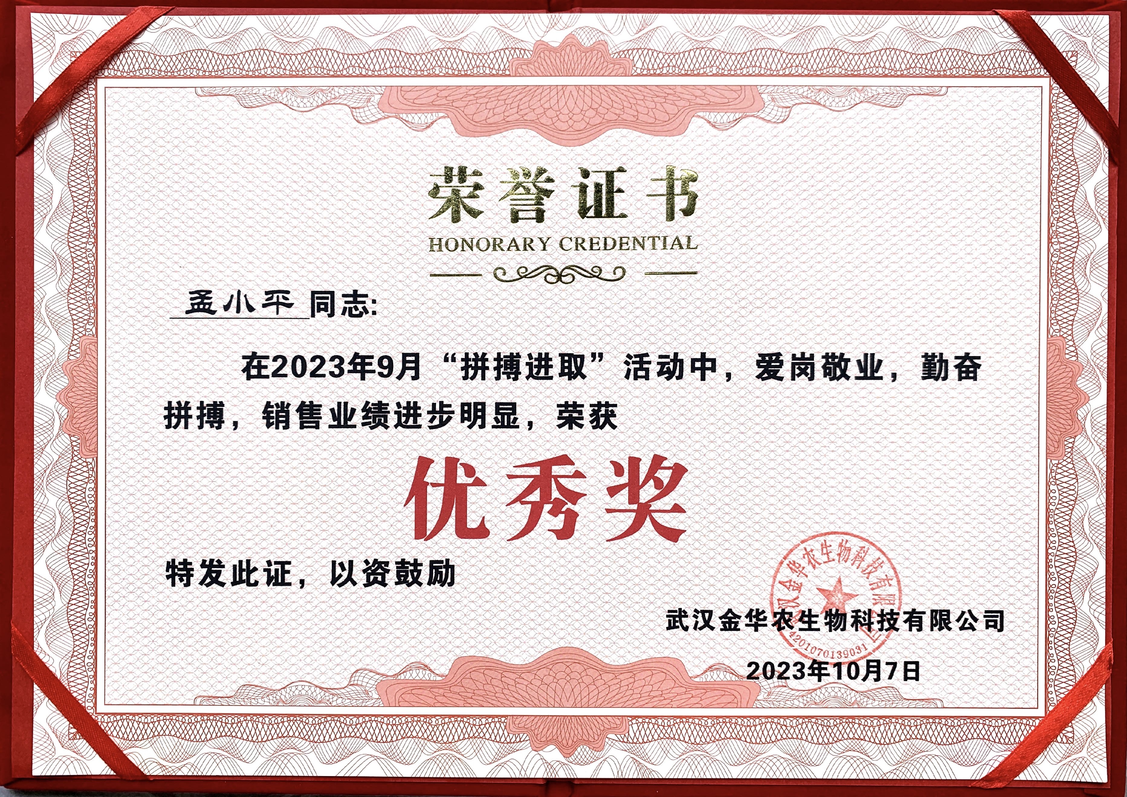 祝賀廣州市場孟小平經(jīng)理在2023年“拼搏進(jìn)取”活動中榮獲優(yōu)秀獎。作為奮斗在市場一線的他,每天要面對形形色色的客戶,想客戶所想,急客戶所急,為客戶排憂解難,獲得了越來越多客戶的認(rèn)可。一切為了銷售、業(yè)績就是最強(qiáng)有力的話語,他自身的價值也在銷售中得到淋漓盡致的體現(xiàn)。他必將帶動武漢金華農(nóng)更加美好的明天。