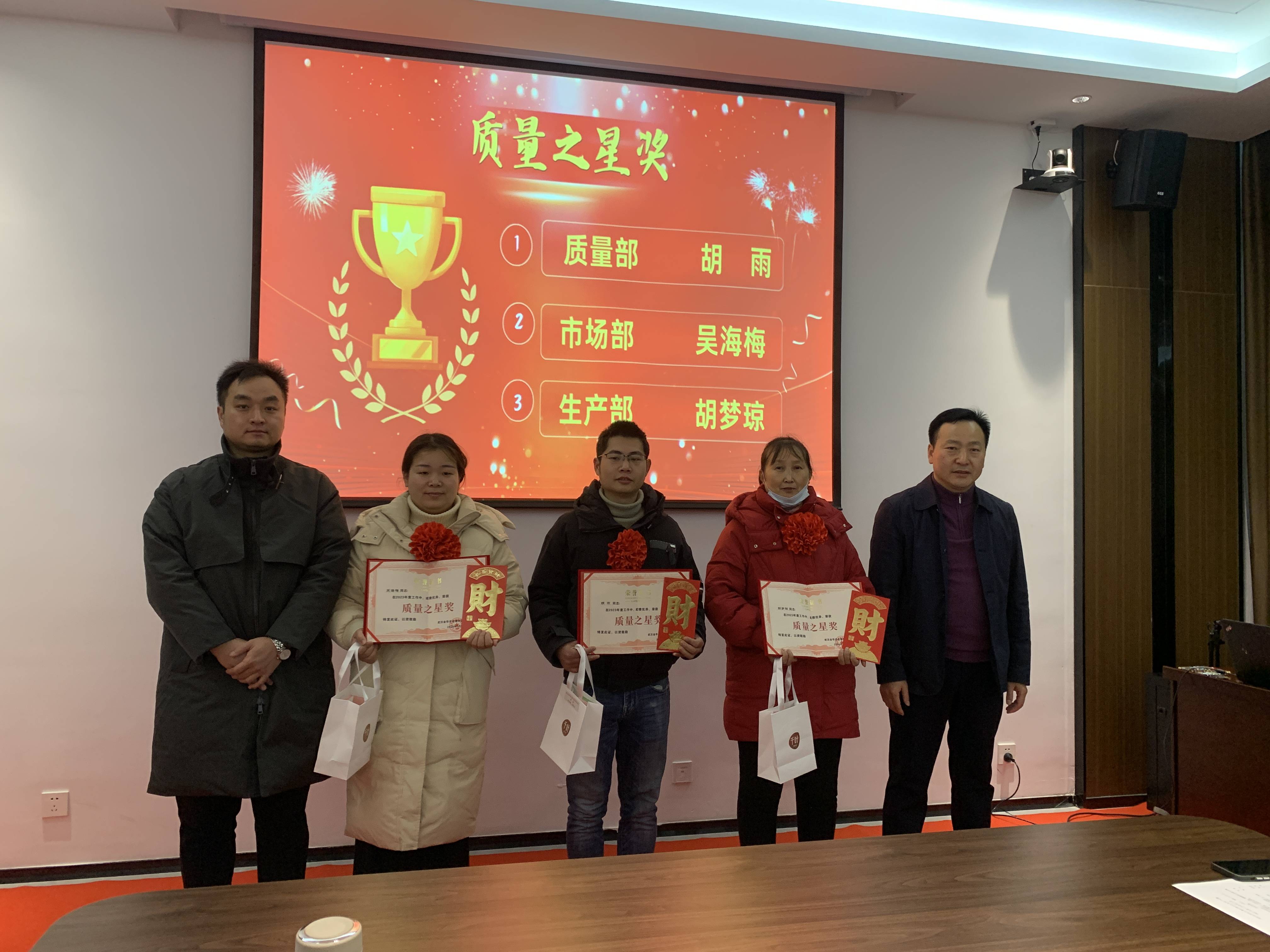 ? ? ? ?辭舊納新,共赴新程。2月5日,武漢金華農(nóng)生物公司2023年行政生產(chǎn)后勤年終工作總結(jié)暨優(yōu)秀員工表彰會(huì)議勝利召開,來自一線崗位的優(yōu)秀員工代表歡聚一堂,喝彩充滿挑戰(zhàn)與收獲的2023年,迎接充滿生機(jī)與發(fā)展的2024年。