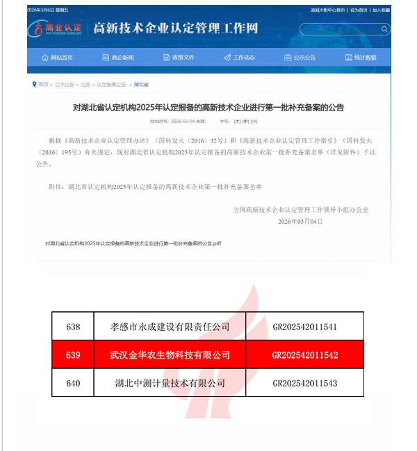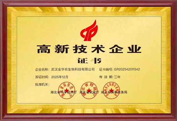 武漢金華農生物科技有限公司于2026年4月獲得國家頒發(fā)高新技術企業(yè)榮譽證書,由科技部、財政部、國家稅務總局在3月公布認定結果。這一榮譽的獲得和認定,標志著武漢金華農生物公司在技術研發(fā)、成果轉化及創(chuàng)新能力等方面獲得了國家級認可。