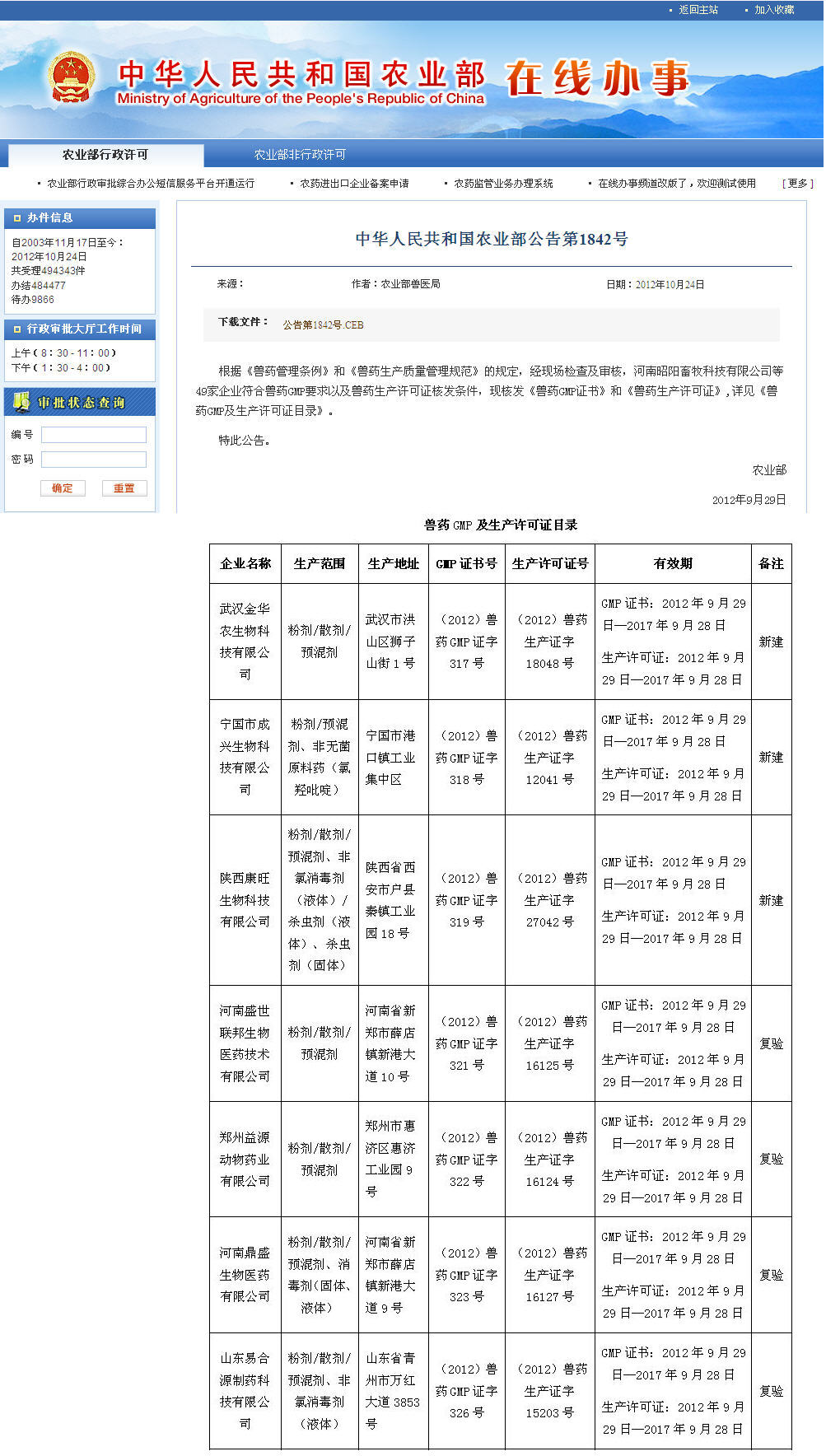 國家農業(yè)部第1842號公告:武漢金華農生物新廠區(qū)榮獲獸藥研發(fā)生產資質
