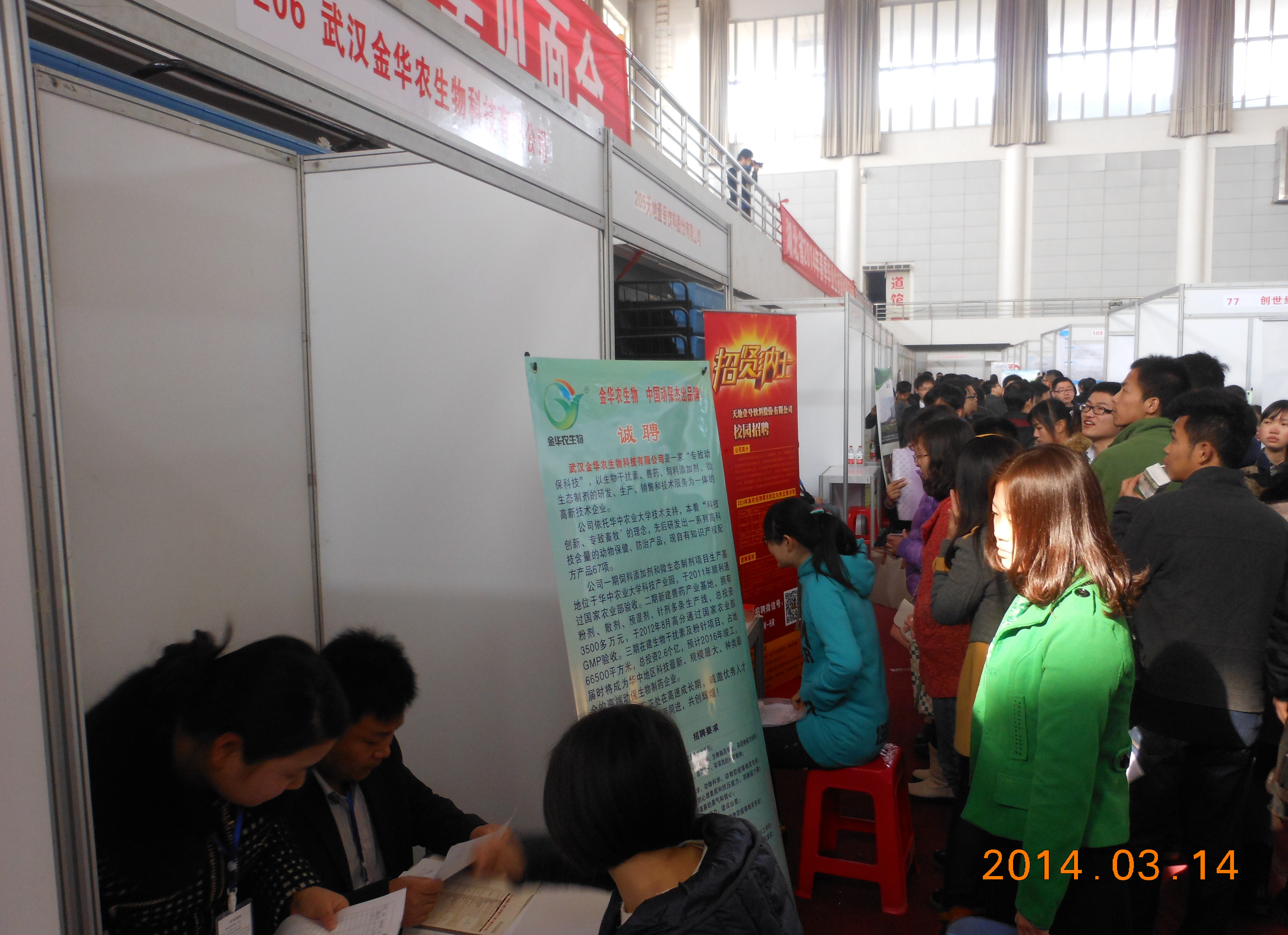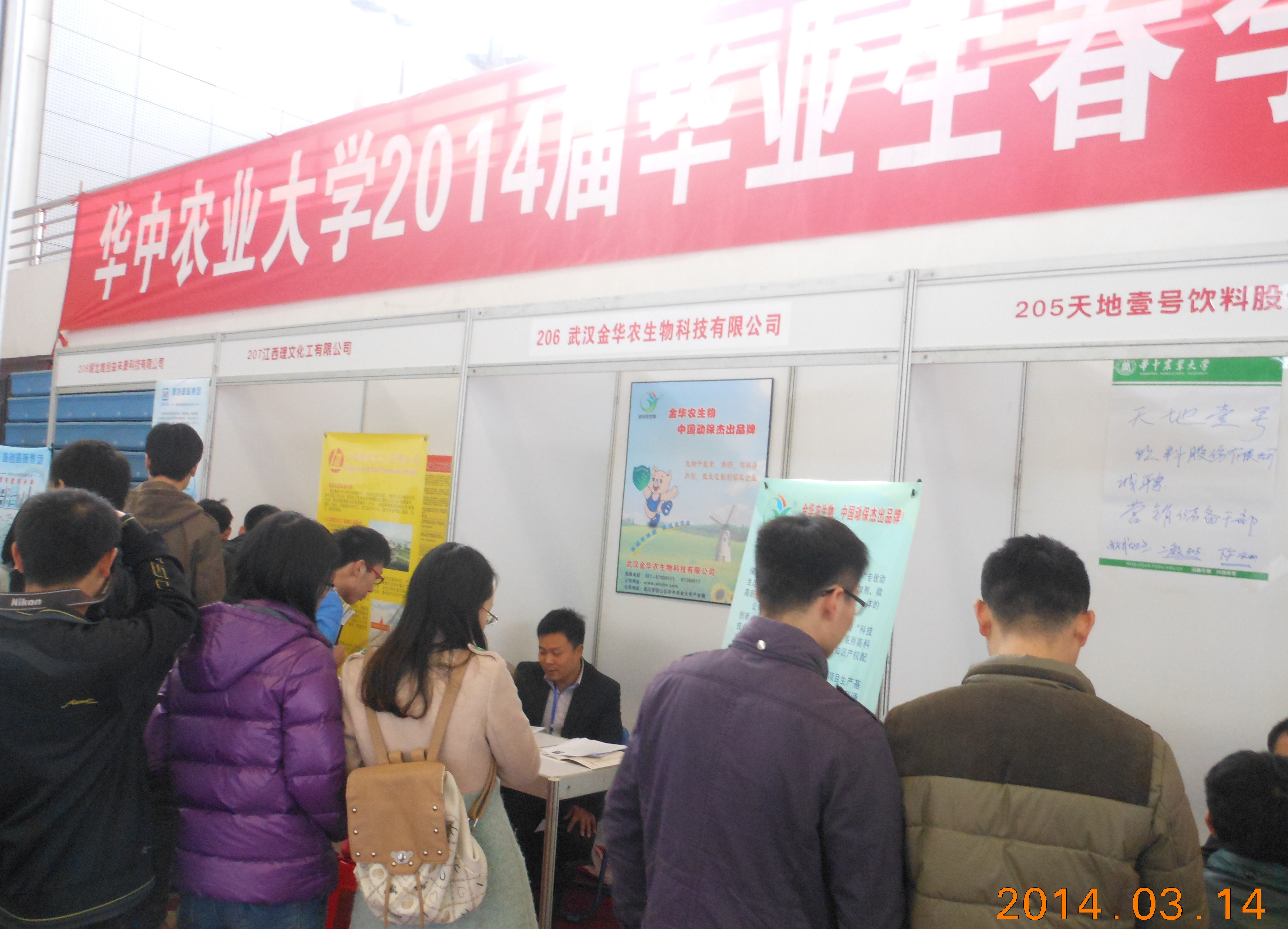 14日,華中農業(yè)大學舉行2014屆畢業(yè)生春季供需見面會,4850余名來自該校及附近高校的畢業(yè)生參加了現(xiàn)場見面會 。應華中農業(yè)大學學生工作處、華中農業(yè)大學科技處的邀請,武漢金華農生物隆重出席了此次招聘會,為公司的高速發(fā)展再次招攬優(yōu)秀人才。