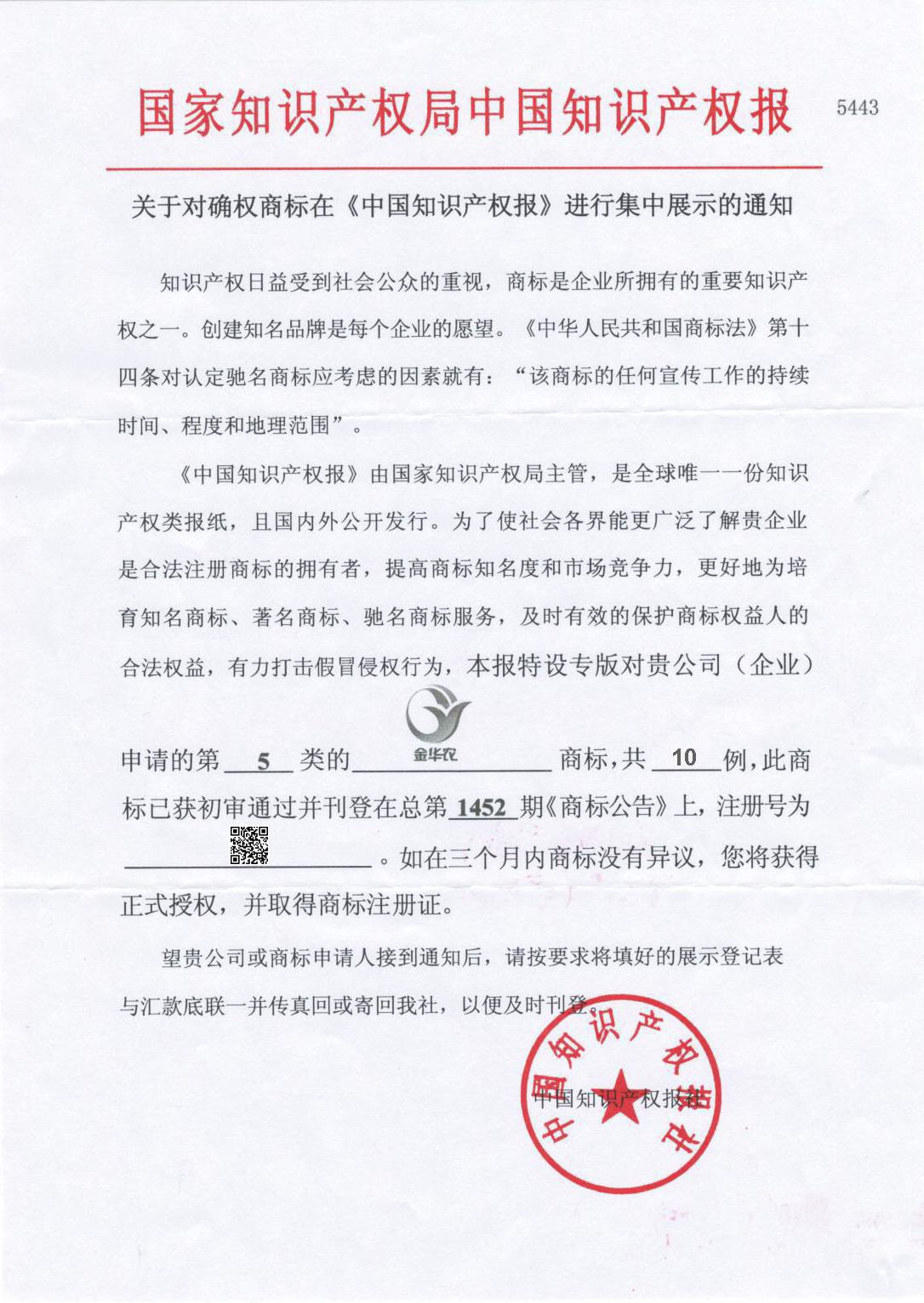 7月22日, 武漢金華農(nóng)生物喜獲國家工商總局頒發(fā)“馳名商標(biāo)”認(rèn)證。經(jīng)國家知識(shí)產(chǎn)權(quán)局授權(quán),中國知識(shí)產(chǎn)權(quán)報(bào)、中國商報(bào)社聯(lián)合對武漢金華農(nóng)生物品牌戰(zhàn)略規(guī)劃、馳名商標(biāo)事項(xiàng)等進(jìn)行專題報(bào)道。