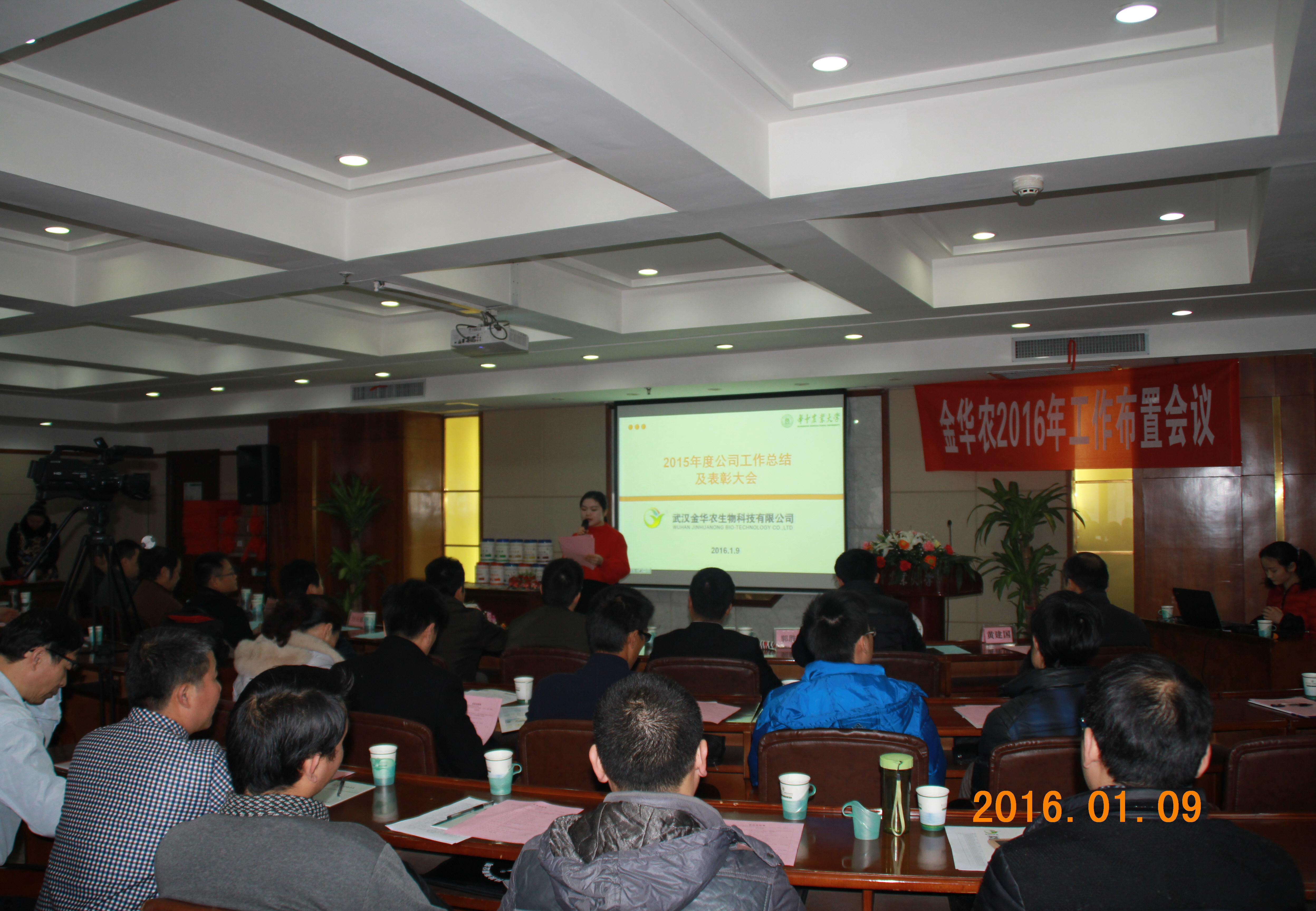 1月8日至12日,武漢金華農(nóng)生物科技有限公司2015年終工作總結(jié)及表彰大會在華中農(nóng)業(yè)大學(xué)國際學(xué)術(shù)交流中心隆重召開,會議總結(jié)了2015年的所取得的工作成績,表彰了市場銷售業(yè)績優(yōu)秀的員工,同時綜合上年度經(jīng)營目標(biāo)及各區(qū)域成績,下達了2016年各區(qū)的銷售戰(zhàn)略任務(wù),統(tǒng)一部署和安排了新一年的工作任務(wù),此次會議取得圓滿成功!