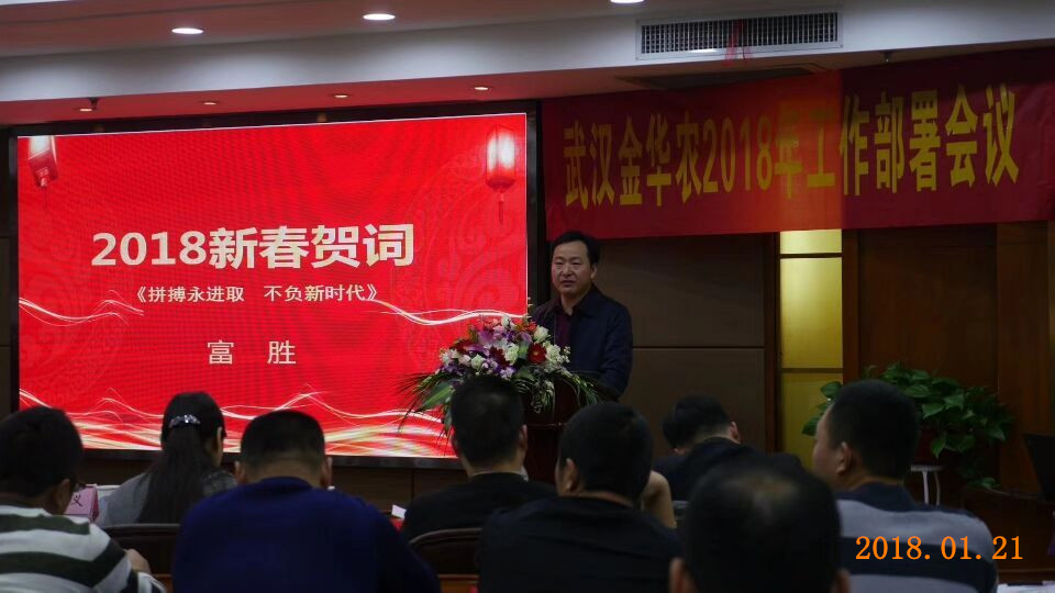 吉祥送春歸,喜慶迎春來(lái),2018新春伊始,我們?nèi)w武漢金華農(nóng)人歡聚一堂,我謹(jǐn)代表武漢金華農(nóng)生物科技有限公司對(duì)大家的到來(lái)表示最熱烈的歡迎!代表公司向一年以來(lái),辛勤付出、努力拼搏、圓滿完成公司各項(xiàng)工作指標(biāo)和任務(wù)的全體員工及其家屬表示最誠(chéng)摯的問(wèn)候!向多年以來(lái),關(guān)心、支持、幫助武漢金華農(nóng)企業(yè)發(fā)展的各位領(lǐng)導(dǎo)、專(zhuān)家教授、合作伙伴和社會(huì)各界朋友們,表示最衷心的感謝!并祝愿大家在新的一年里身體健康、生活幸福、工作順心、事業(yè)進(jìn)步!