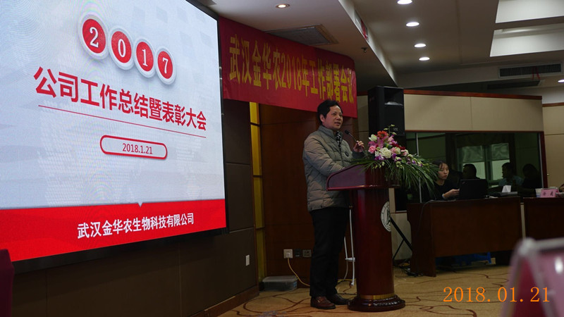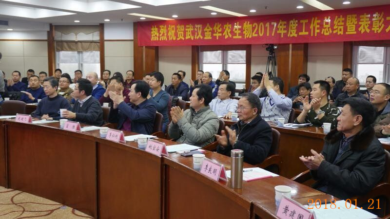 2018年1月20日~24日,武漢金華農生物科技有限公司2017年度工作總結暨表彰大會,在華中農業(yè)大學隆重勝利召開,學校、院系領導、博士生導師、教授專家、公司高層、全國21個省市的精英代表齊聚盛會,百人團隊學習交流、總結經驗、表彰先進、規(guī)劃未來。